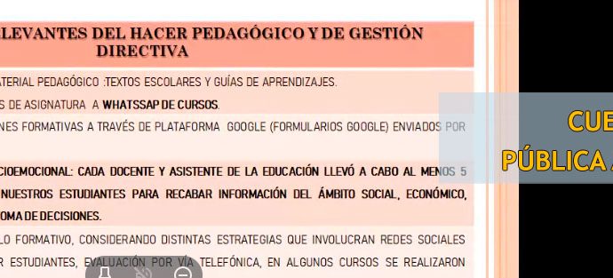 La Cuenta Pública es un instrumento que permite a los organismos públicos transparentar sus procesos internos con la comunidad, debido a ello, nuestra Directora Sra. Yasmin Garrido Diaz realizó a través de la plataforma online Google Meet el pasado viernes 23 de Abril de 2021 la Cuenta Pública del año 2020.